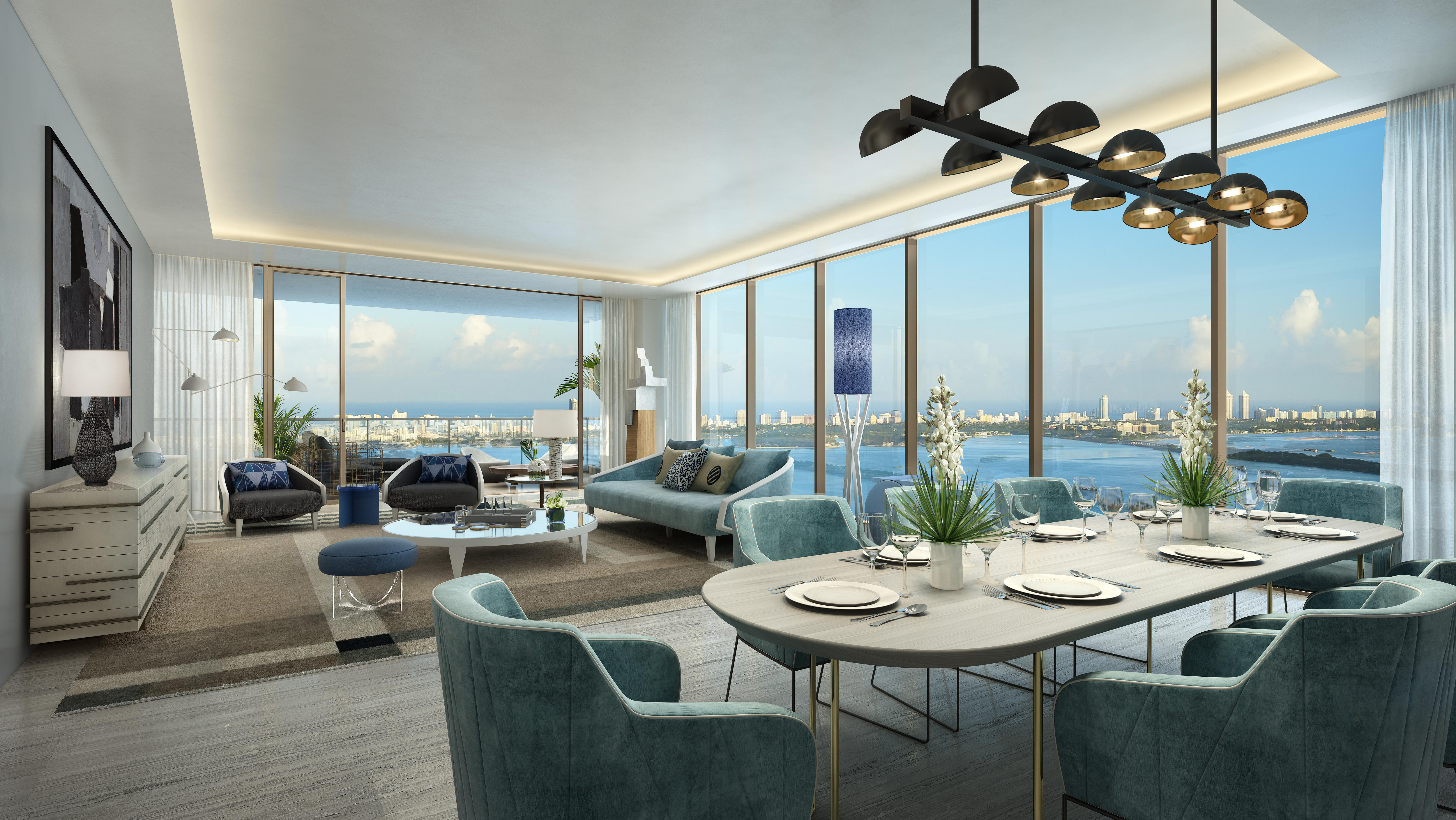 Rising 57 stories directly on Biscayne Bay, Elysee will be home to 100 half-floor and full-floor residences with three- to five-bedroom units ranging in size from 2,300 to 4,000 square feet. The slender glass tower, designed by Arquitectonica, features a unique three-tiered telescoping shape providing direct unobstructed 180 degree bay and city views from every residence.