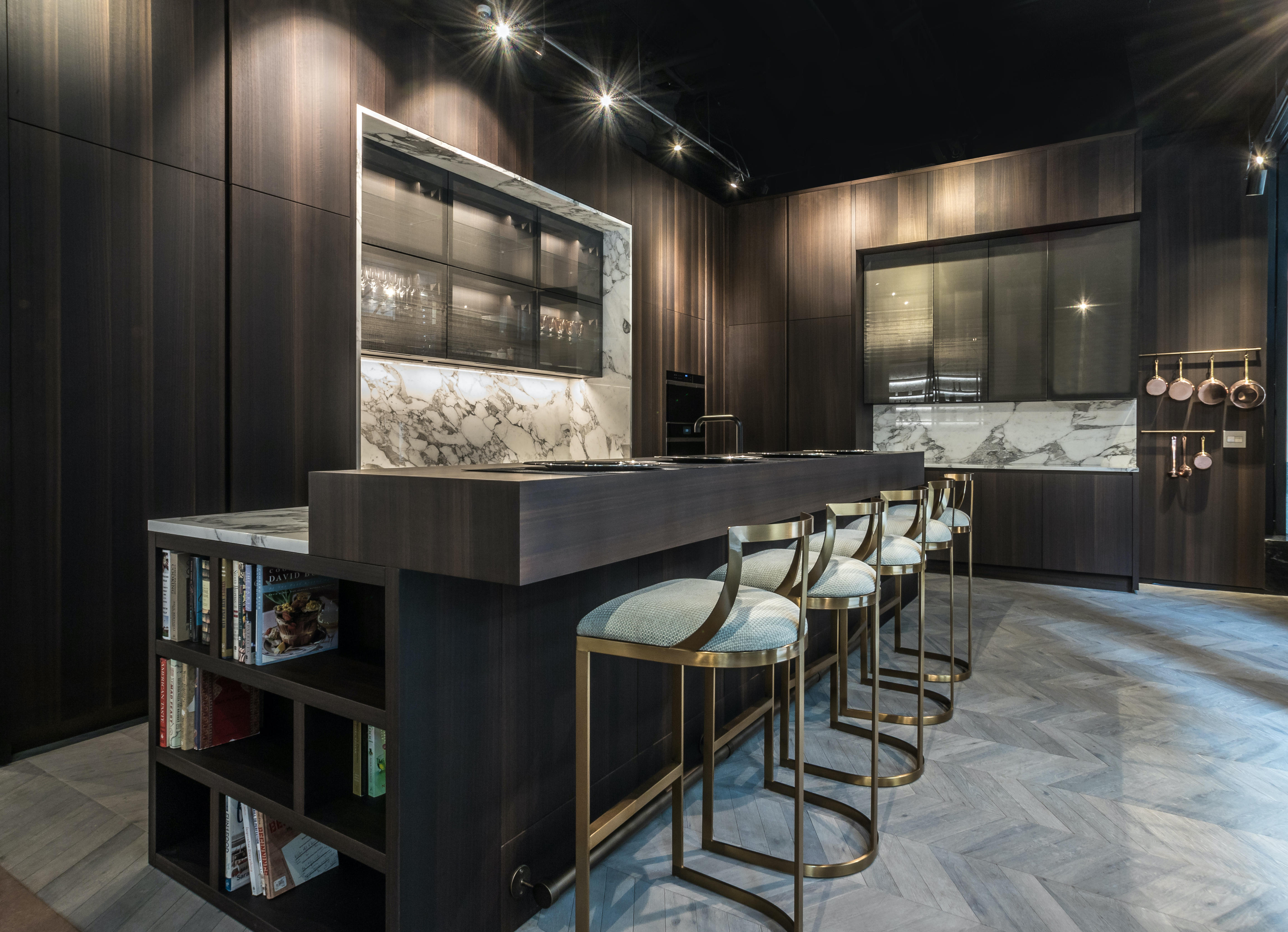In order to draw potential customers and designers in, the company created a towering 13.5′ kitchen featuring book-matched wood at the entrance to the showroom. The custom kitchen was created by rescaling previous kitchen models and sourcing materials on a greater scale, requiring the collaboration of a team of ITALKRAFT designers. A variety of Sub-Zero and Wolf appliances complement the sleek, modern European kitchen vignettes. Click here to read story