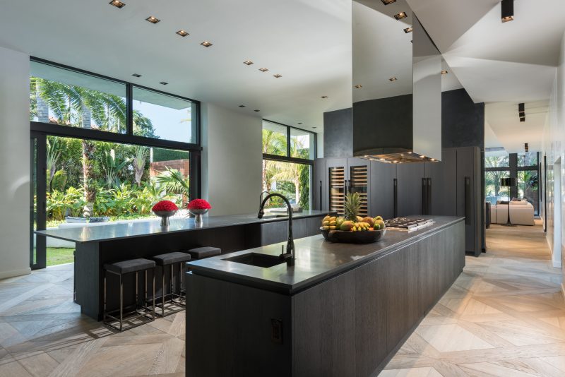 ITALKRAFT’s Custom Luxury Kitchen at 3114 North Bay Road incorporates key elements of modern design, seamlessly combining clean lines, a bold mirrored stove, and an open concept layout.